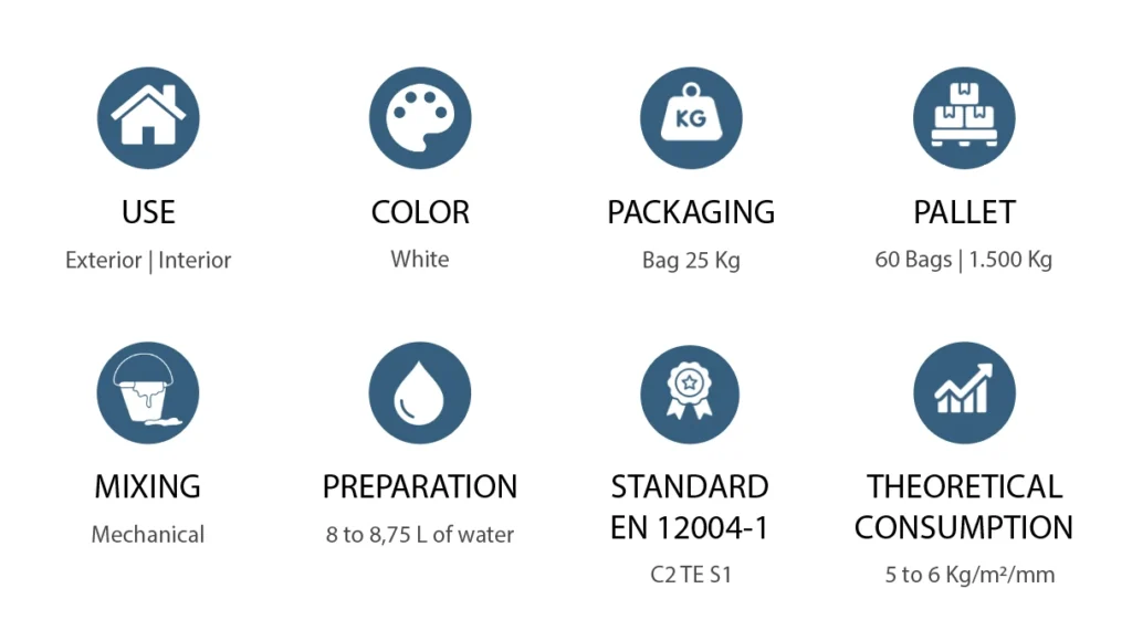 Mix the contents of the 25 kg bag with approximately 8 to 8.75 liters of clean water until a homogeneous mixture is obtained, free of lumps. Once mixed, let the mortar rest for 5 minutes, then stir again before application. Spread the adhesive well using a notched trowel (6 to 8 mm). Then, place the piece to be bonded, pressing it with vibrating movements until a layer of approximately 4 mm thickness is achieved. Gently tap with a rubber mallet without damaging the surface of the ceramic pieces.