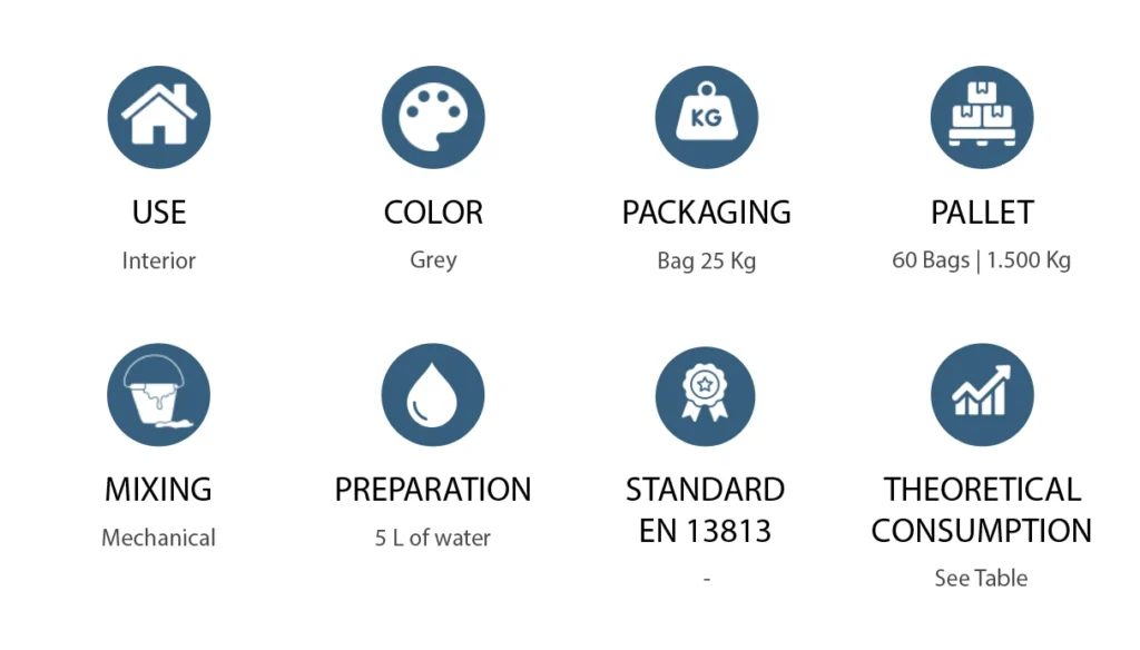 Self-leveling technical mortar used for interior floor leveling, filling, and surface leveling of concrete and mortar where a thin layer is required.